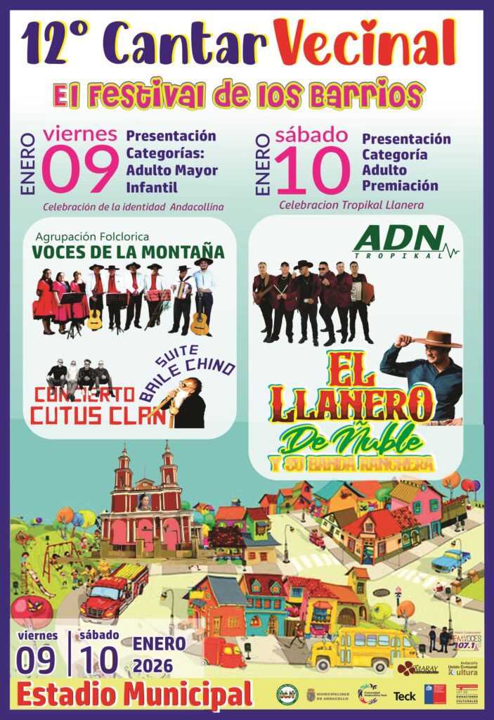 El viernes 9 de enero estará dedicado al folclore local con la presentación del grupo “Voces de la Montaña”, que pondrá en escena expresiones vinculadas a la identidad andacollina. En tanto, el sábado 10 la cumbia marcará la jornada con la participación de la banda ADN Tropical y “El Llanero del Ñuble y su banda ranchera”, quienes animarán la competencia por el título del Festival de los Barrios.